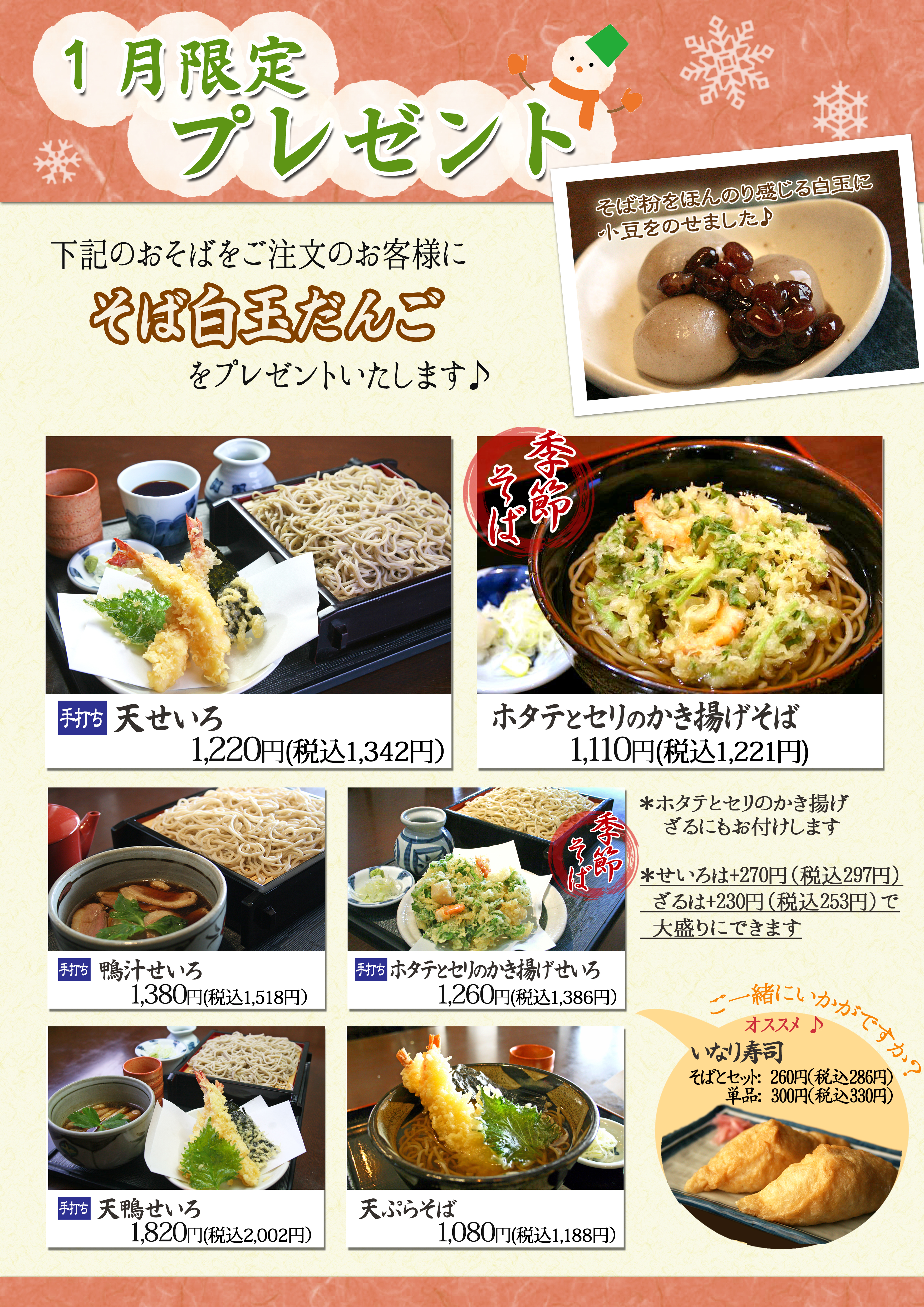 季節そば、鴨汁せいろ、天せいろ、天鴨せいろ、天ぷらそばをご注文のお客様にはデザートにそば白玉だんごをプレゼントさせていただきます。